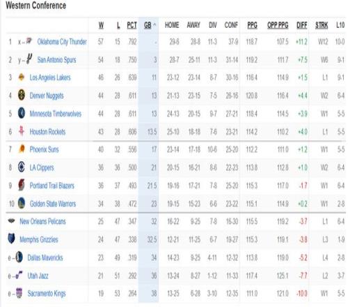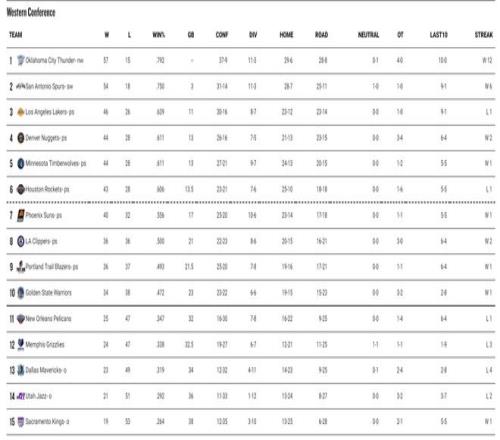 详细的排名情况:1-3:雷霆、马刺、湖人;(前二锁定季后赛)