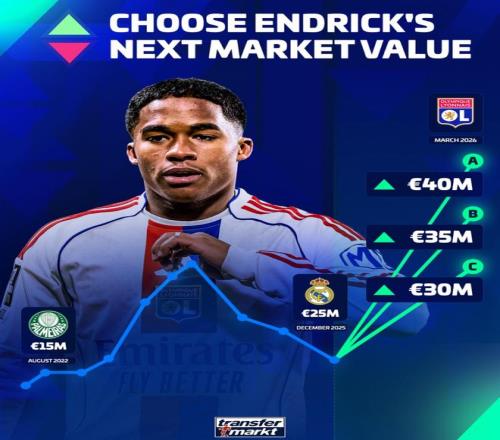 德转给出了三个可能的结果,上涨至3000万欧,上涨至3500万欧,上涨至4000万欧。目前球员的身价为2500万欧。