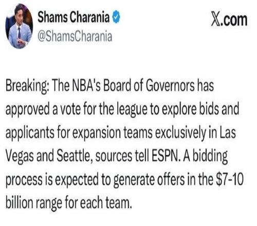 北京时间3月25日,根据ESPN名记Shams最新报道,NBA扩军迎来实质性进展,NBA董事会已批准投票,决定仅在拉斯维加斯和西雅图两座城市,探索扩张球队的投标与申请,而竞标过程预计新增球队的出价将在70亿至100亿美元之间。