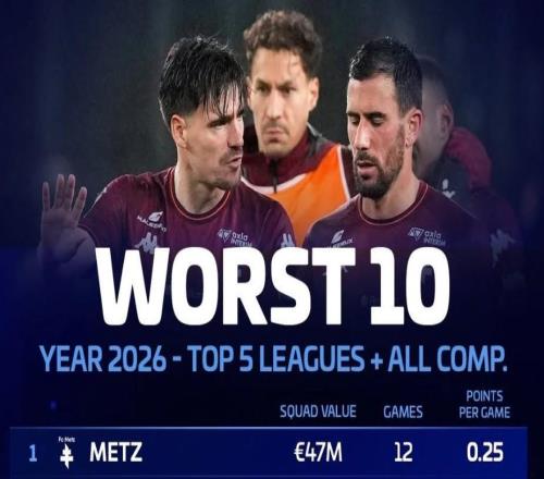 北京时间3月24日,德转统计出了2026年至今各项赛事场均积分最低的10支欧洲五大联赛球队,梅斯以0.25分位列倒数...