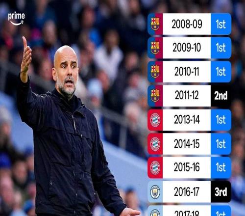 据亚马逊Prime Video Sport统计,瓜迪奥拉执教生涯中从未连续两年无缘联赛冠军,联赛最差成绩为第三。自2008-20...