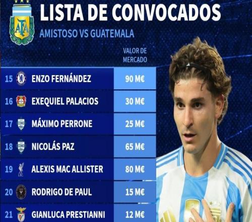 新一期阿根廷队身价榜:小蜘蛛、恩佐9000万欧第1,梅西1500万