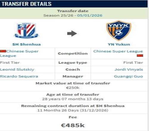德转:费尔南多从申花加盟云南的转会费约100万人民币