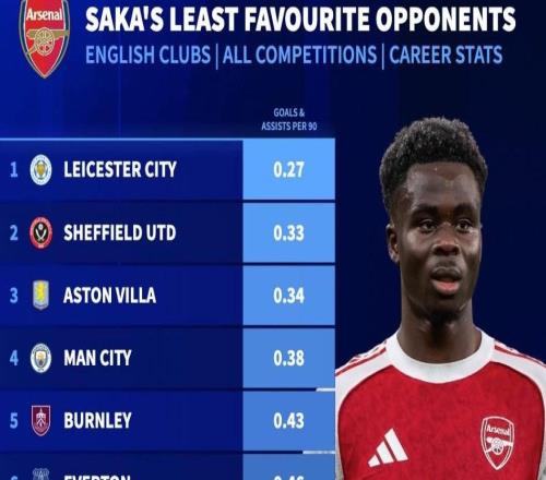 萨卡14次对阵曼城只造4球,生涯英格兰范围内所有对手第四低