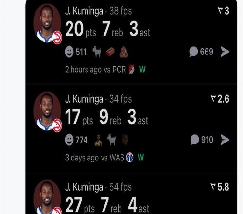 截至目前,库明加为老鹰出战3场比赛,帮助球队拿下全胜,场均能轰下21.3分7.7篮板3.3助攻,投篮命中率高达67.7%,三分...