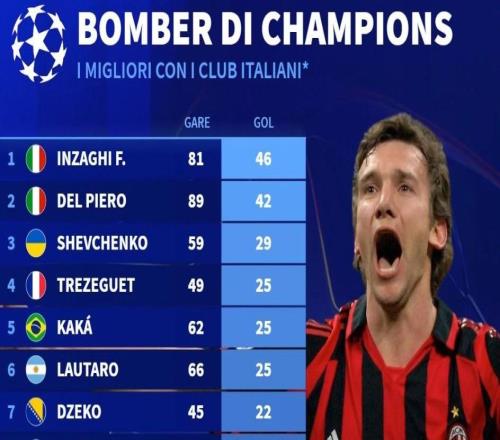 意甲球员欧冠历史进球榜:九爷46球第1,现役劳塔罗25球最多