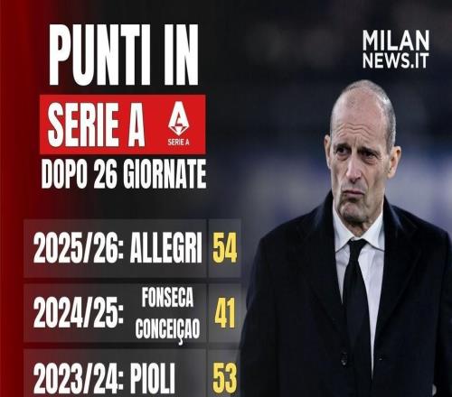 北京时间2月24日,米兰新闻网统计出了AC米兰近8个赛季意甲前26轮过后的成绩,本赛季阿莱格里率队拿到54分为近8...