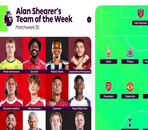 英超第30轮战罢,英超官方公布了阿兰-希勒评选的本轮最佳阵容,布鲁诺-费尔南德斯、道曼、里沙利松等人在列。阿...