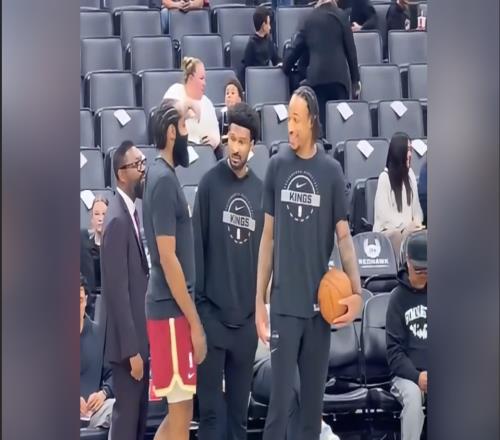 你看!这是哈登加盟骑士首秀的一幕,德罗赞和哈登深情拥抱在一起。哈登抚摸着阿赞的肩膀,而一向沉默的阿赞,也在哈...