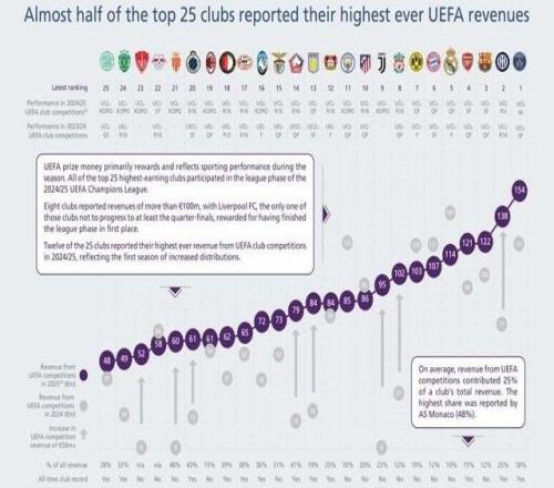 2025年欧足联赛事奖金排行:巴黎1.54亿欧居首,8队超1亿欧