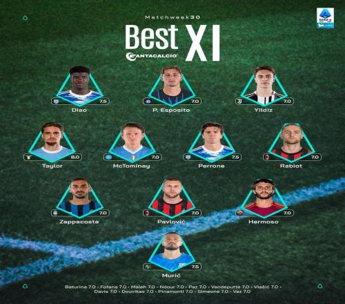 意甲第30轮最佳阵:皮奥、伊尔迪兹、麦克托米奈、拉比奥入选