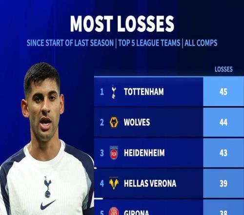 热刺上赛季以来各项赛事输掉45场,五大联赛最多
