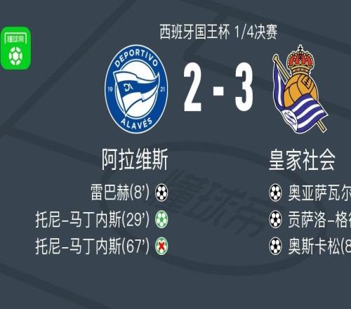 北京时间2月5日西班牙国王杯 1/4决赛,阿拉维斯对阵皇家社会。阿拉维斯雷巴赫破门,托尼-马丁内斯破门。皇家社...